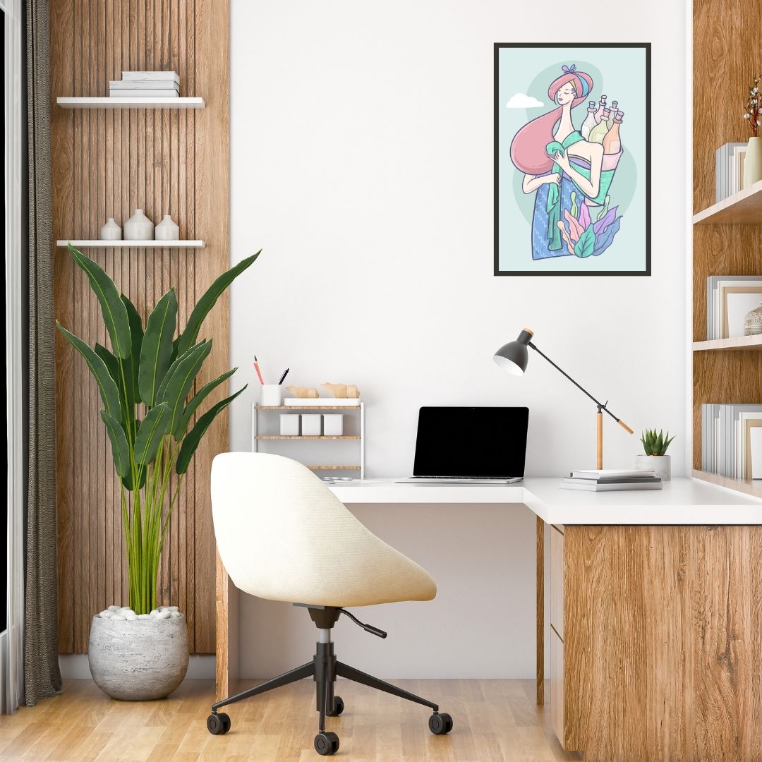 - Includes wall art featuring a depiction of a woman selling a traditional drink